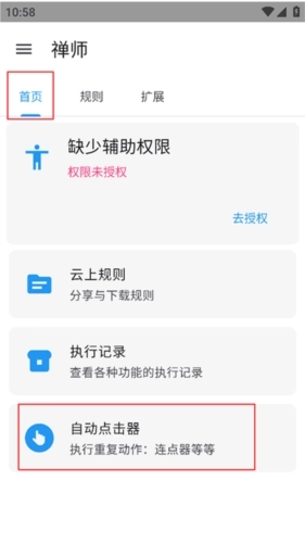 1、在首页中点击自动点击器,打开自动点击器开关