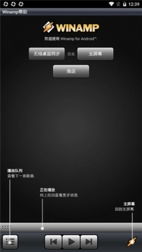 用户首次启动Winamp手机版时,会听到浑厚的英文男声旁白与咩咩的羊叫声,随后软件进入产品介绍界面。界面左下方显示播放列表(PlayQueue),正在播放的音乐内容以向上滑动的动画形式呈现。底部中间位置设有三个功能按钮,分别对应上一首、下一首及播放/暂停操作,用户无需额外标识即可快速识别。此外,当用户点击右下方的Winamp经典LOGO时,即可切换至软件的主界面。
