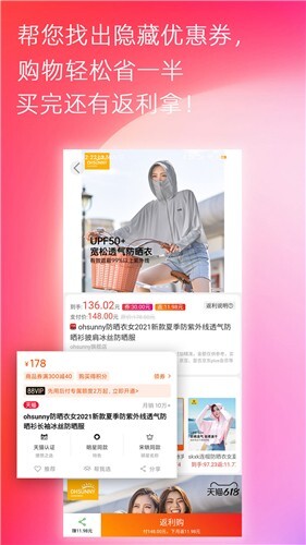高返优惠券软件是一款便捷实用的网购优惠券搜索与使用工具,能让用户快速定位所需商品的优惠券,借助优惠券获取购物实惠。此外,该软件还会呈现商品的详细信息、用户评价以及销量数据等内容,便于用户做出更合适的购物选择。