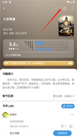 2、进入详情页后,可查看小说的简介与章节列表,还能选择将其加入书架、进行免费阅读等操作,同时可点击右上角的分享功能。