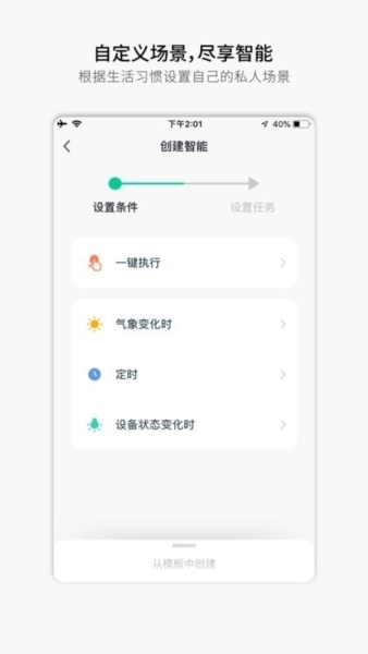 1、自定义场景功能,支持每个人依据自身生活习惯,创建专属的个性化智能场景;