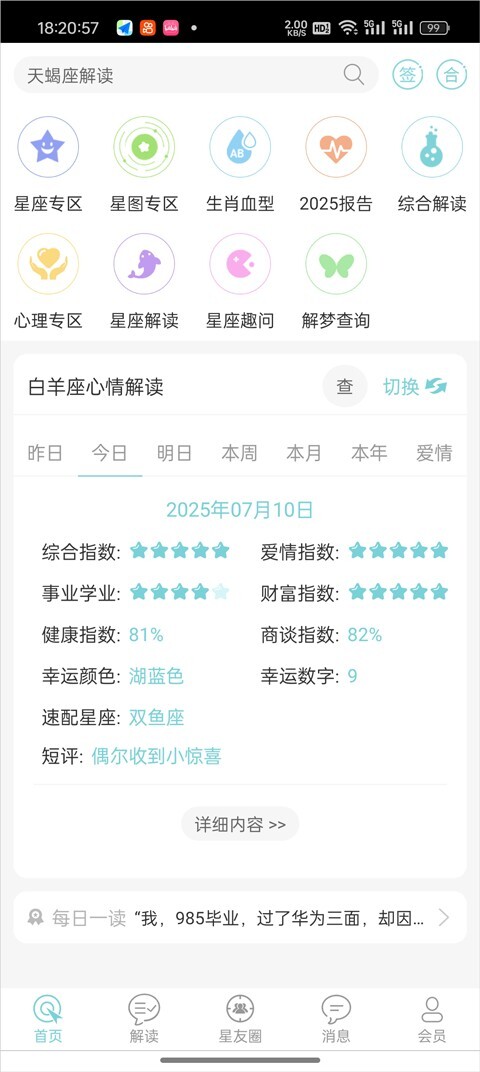 1. 星座板块,为你提供每日运势的全方位解析,助力你掌握12个星座在每日、每周、每月以及每年不同时间维度上的运势动态变化。