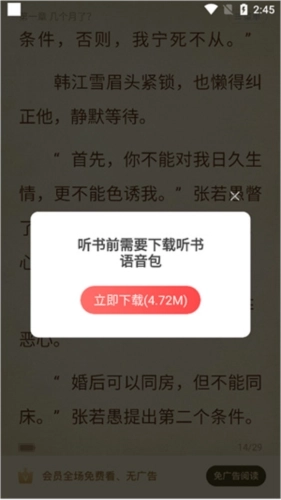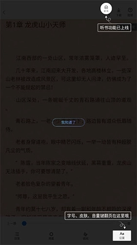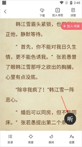 听书模式仅支持已配备语音包的小说,用户可进入小说阅读页面,点击右上角的菜单按钮,若页面显示【听】图标(即下图红色箭头指向的位置),则表明该小说可开启听书模式。