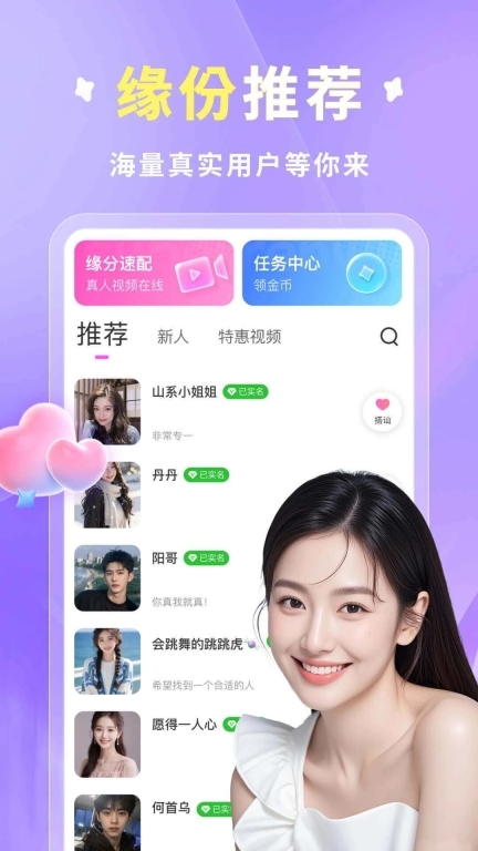 1、首页设有缘分速配和任务中心功能,还能为用户推荐各类不同人群。