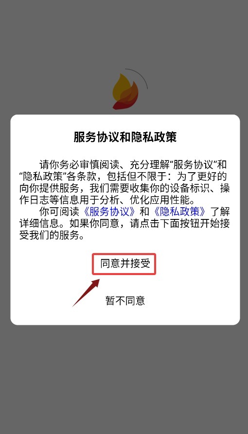 首次打开应用时,需点击同意并接受相关协议,确认后才能进入主界面。