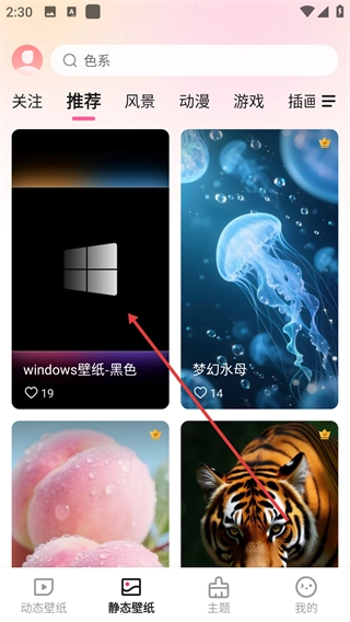 点击底部的【静态壁纸】选项,就能进入静态壁纸页面,在该页面可以浏览各类静态壁纸分类以及系统推荐的壁纸。