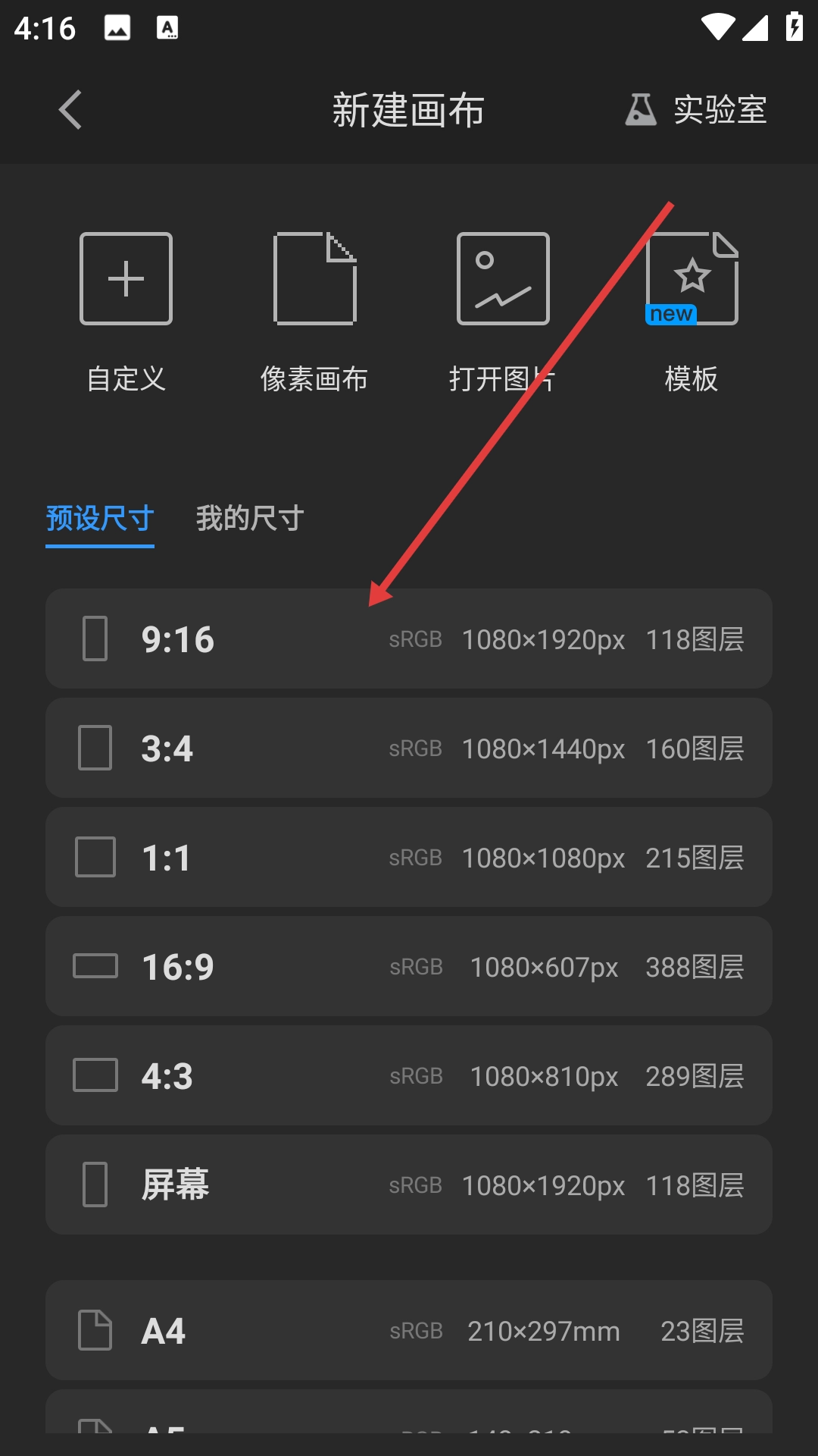 在新建画布的页面里挑选预设好的尺寸(比如9:16),然后就能进入绘图界面了。