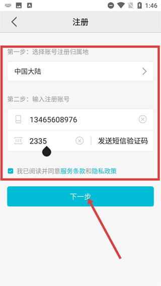 在注册页面,先选择账号注册归属地,接着输入手机号码与短信验证码,勾选同意相关条款后点击【下一步】按钮,然后继续完成后续的注册步骤。