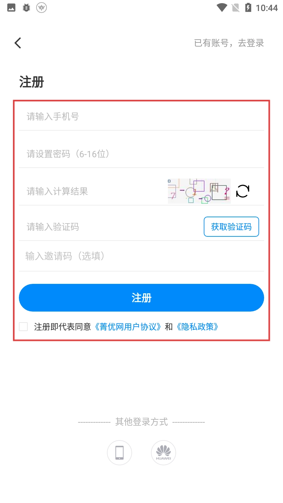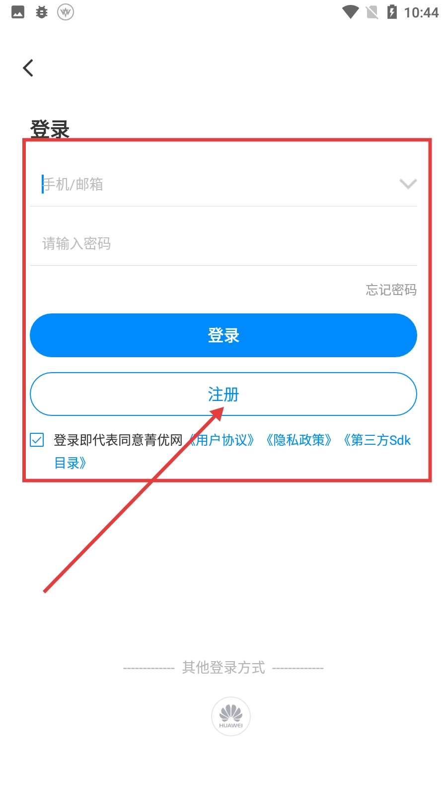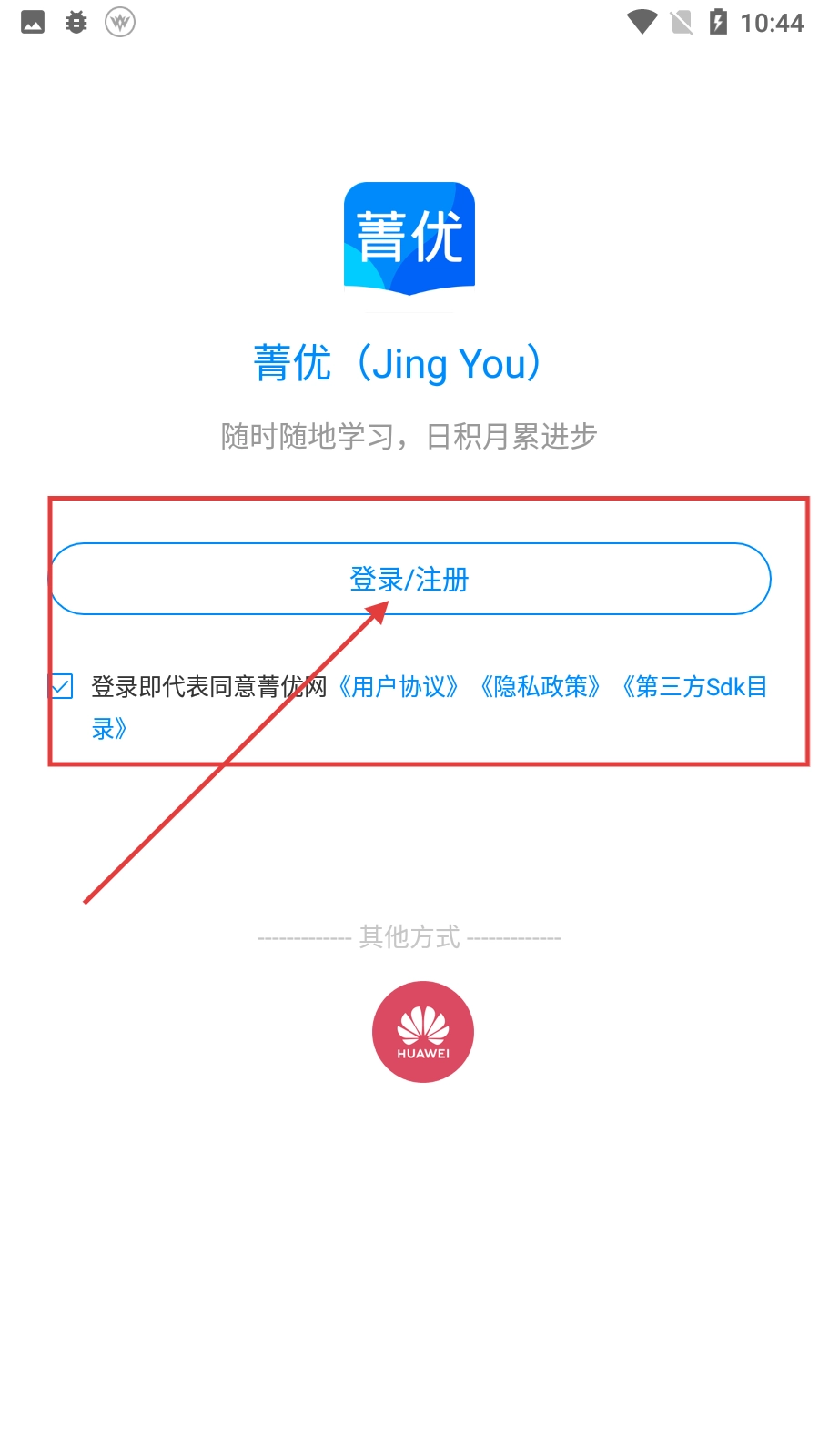 在使用菁优的过程中,需要点击【登录/注册】按钮进入对应的页面,之后勾选同意相关协议,才能开展后续的操作。