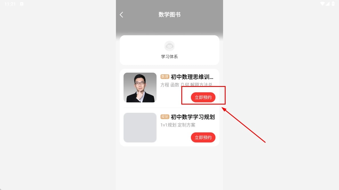 在数学图书的页面上,点击标有“立即预约”的功能按钮,即可预约初中数理思维训练的相关内容。