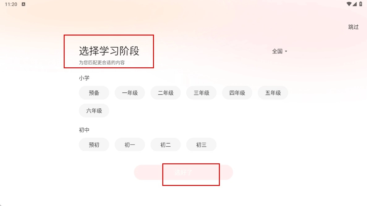 在【选择学习阶段】功能模块中,选定对应的学段年级后,点击【选好了】功能按钮即可。
