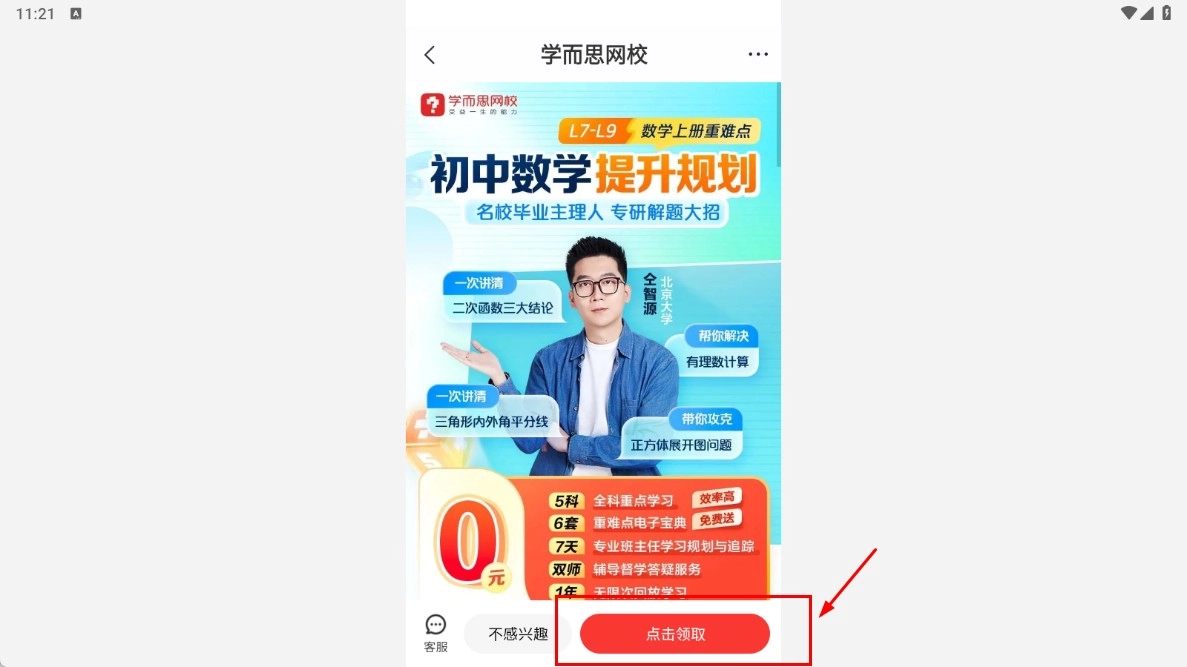 当学而思网校初中数学提升规划的页面弹出后,找到并点击【点击领取-功能按钮】,即可获取对应的学习资源。