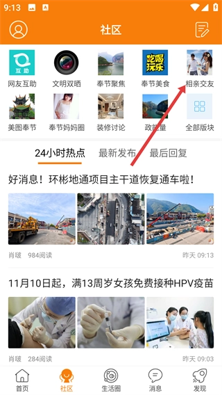 在社区页面里,找到【相亲交友】板块的入口,点击进入这个板块,浏览相关的内容。