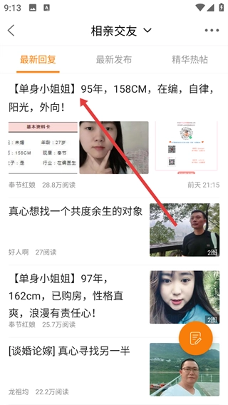 进入相亲交友板块后,你可以浏览【最新回复】【最新发布】等不同分类下的相亲帖子,挑选自己感兴趣的点击查看详情。