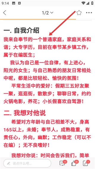点击具体的相亲帖子后,就能查看【自我介绍】【我想对他说】等详细内容,从而了解相亲者的相关信息。