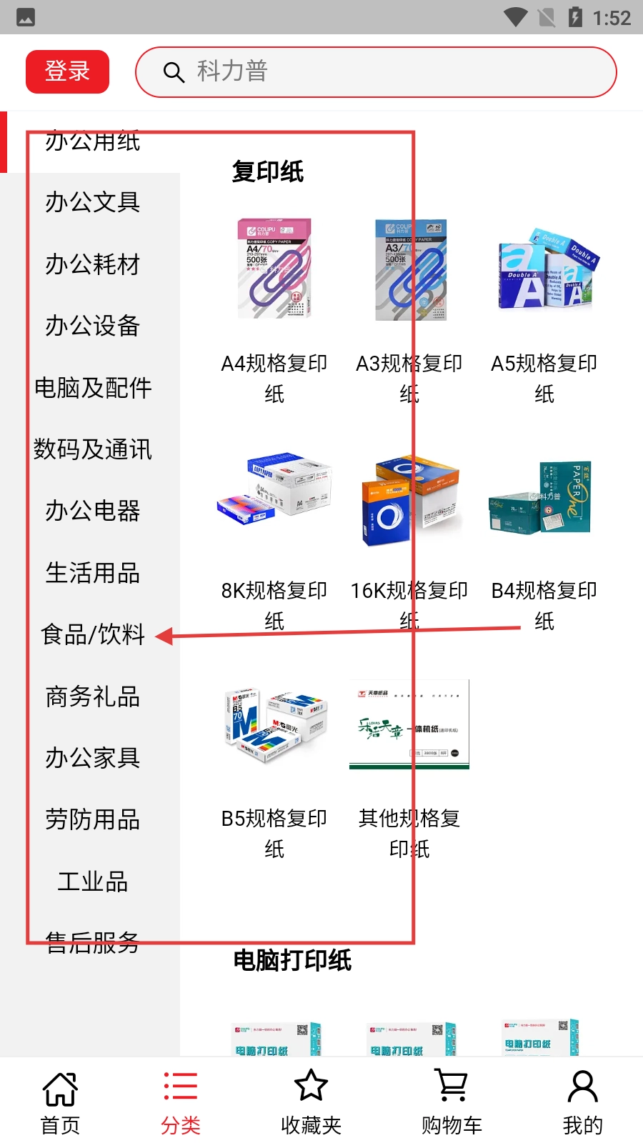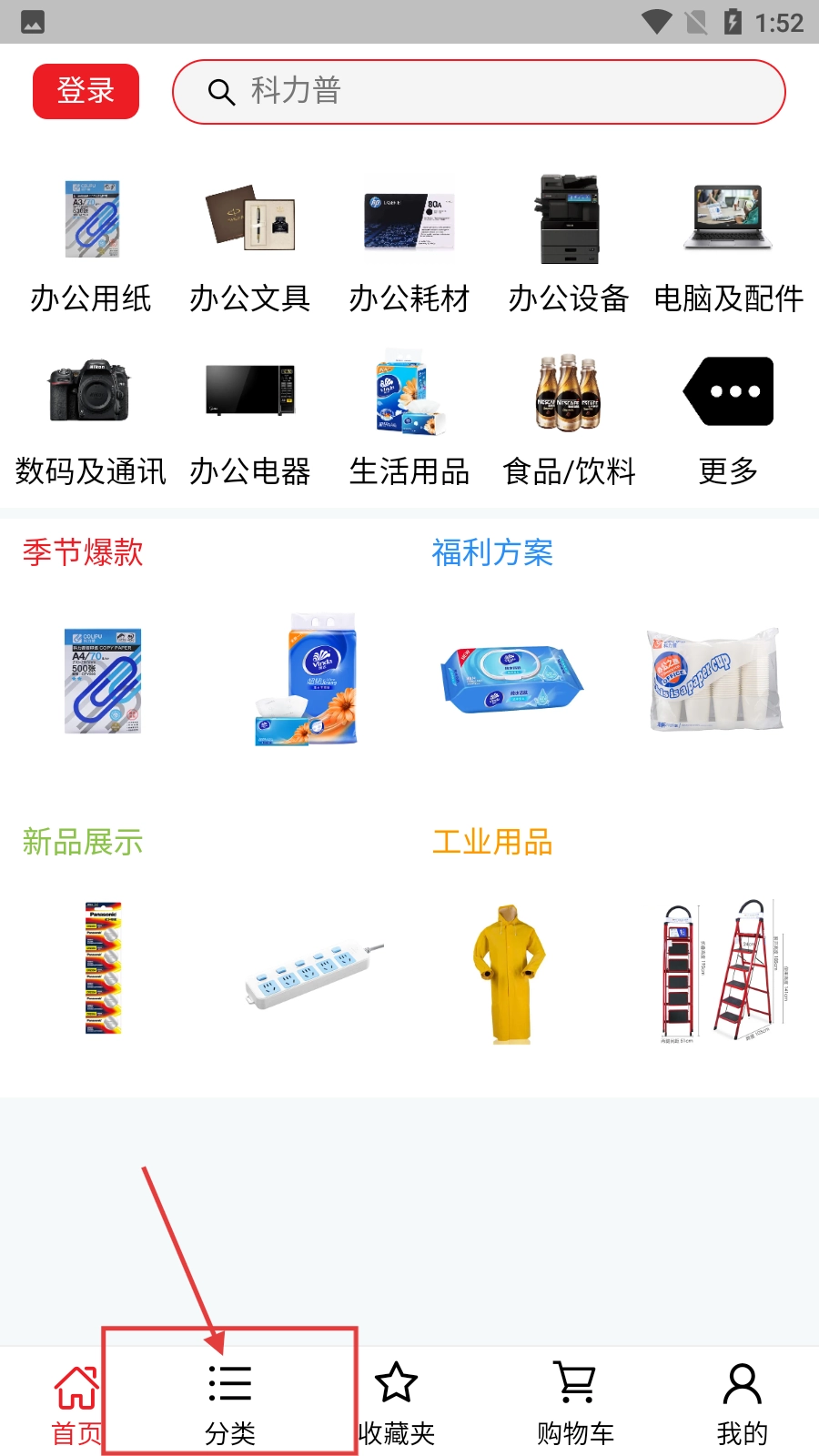 进入科力普首页后,点击页面底部的【分类】选项,即可进入商品分类页面,在该页面能够浏览办公用纸、文具等多种商品分类。