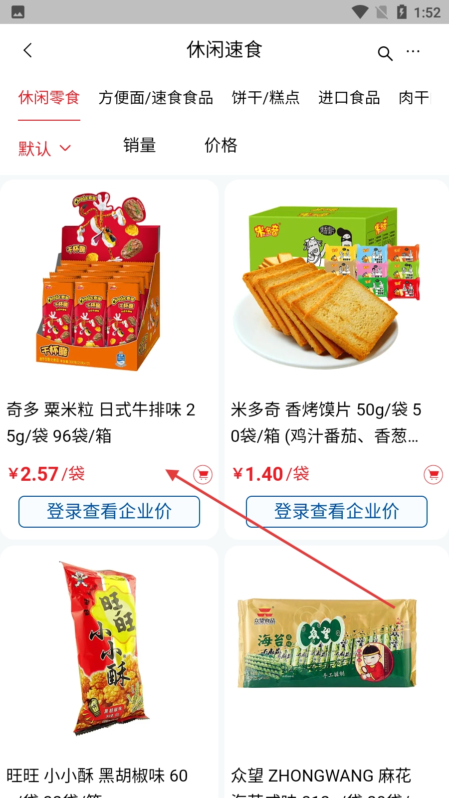 进入【休闲速食-休闲零食】的页面后,浏览展示的商品列表,挑选自己喜欢的零食,像奇多粟米粒这类就很合适。