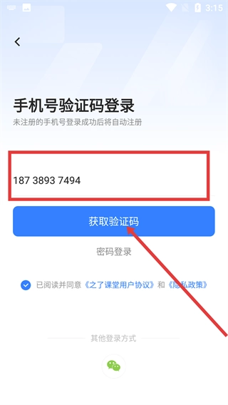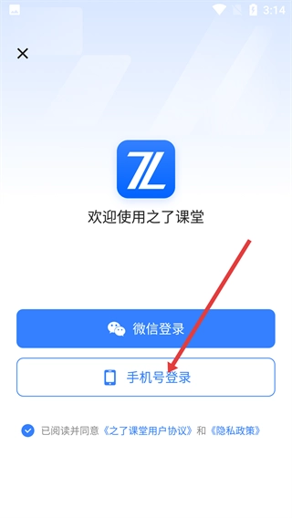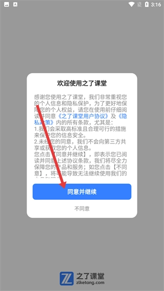 在之了课堂弹出的用户协议窗口里,点击【同意并继续】按钮,就能进入选择登录方式的页面。
