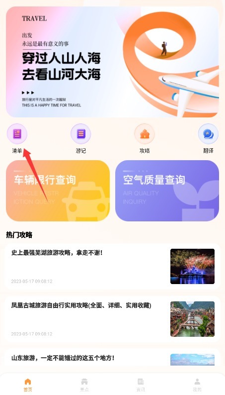 1. 开启应用,进入主页面,寻找到清单功能按钮,点击该按钮,进而进入旅行清单管理界面。
