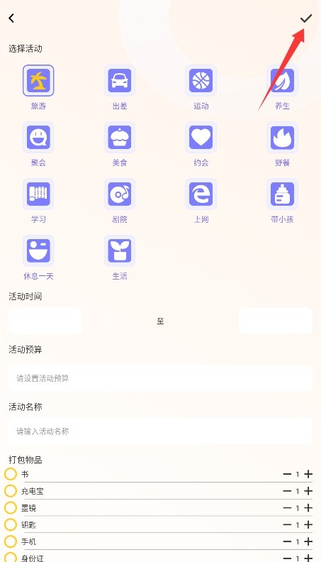 3、在制作个性化行李清单时,只需选择同行人数与活动类型这两个参数,应用便会分类展示建议物品列表,而且还支持进行个性化的调整与修改。