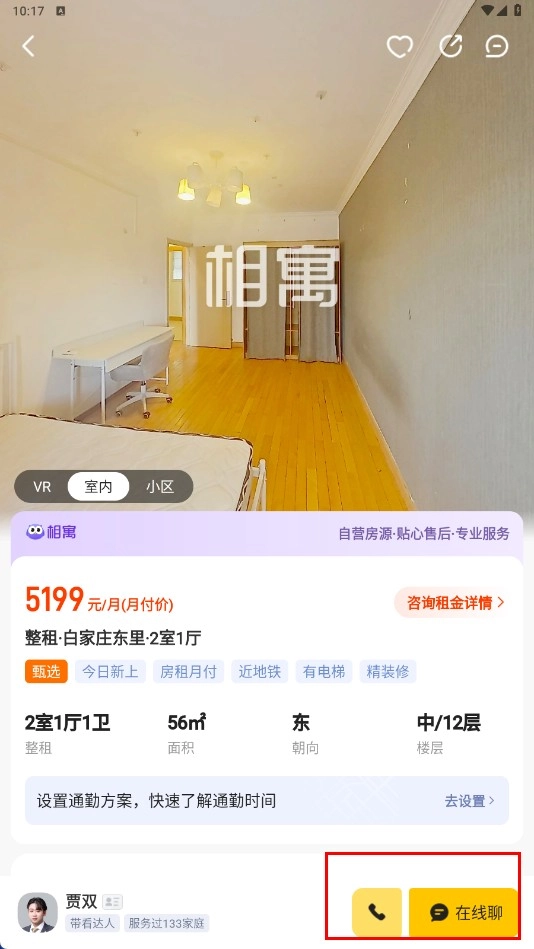 进入房源详情页面后,你可以点击【电话】按钮或者【在线聊】功能按钮,和经纪人交流租房相关的事情。
