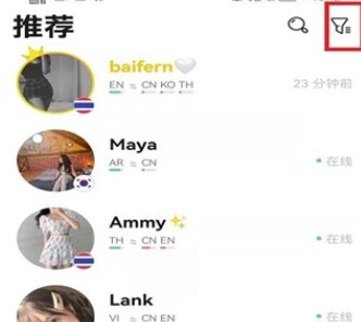 2、接着在推荐列表里,能够挑选外国好友展开聊天,要是希望匹配到更多外国人,可点击右上角图标,进入筛选界面。