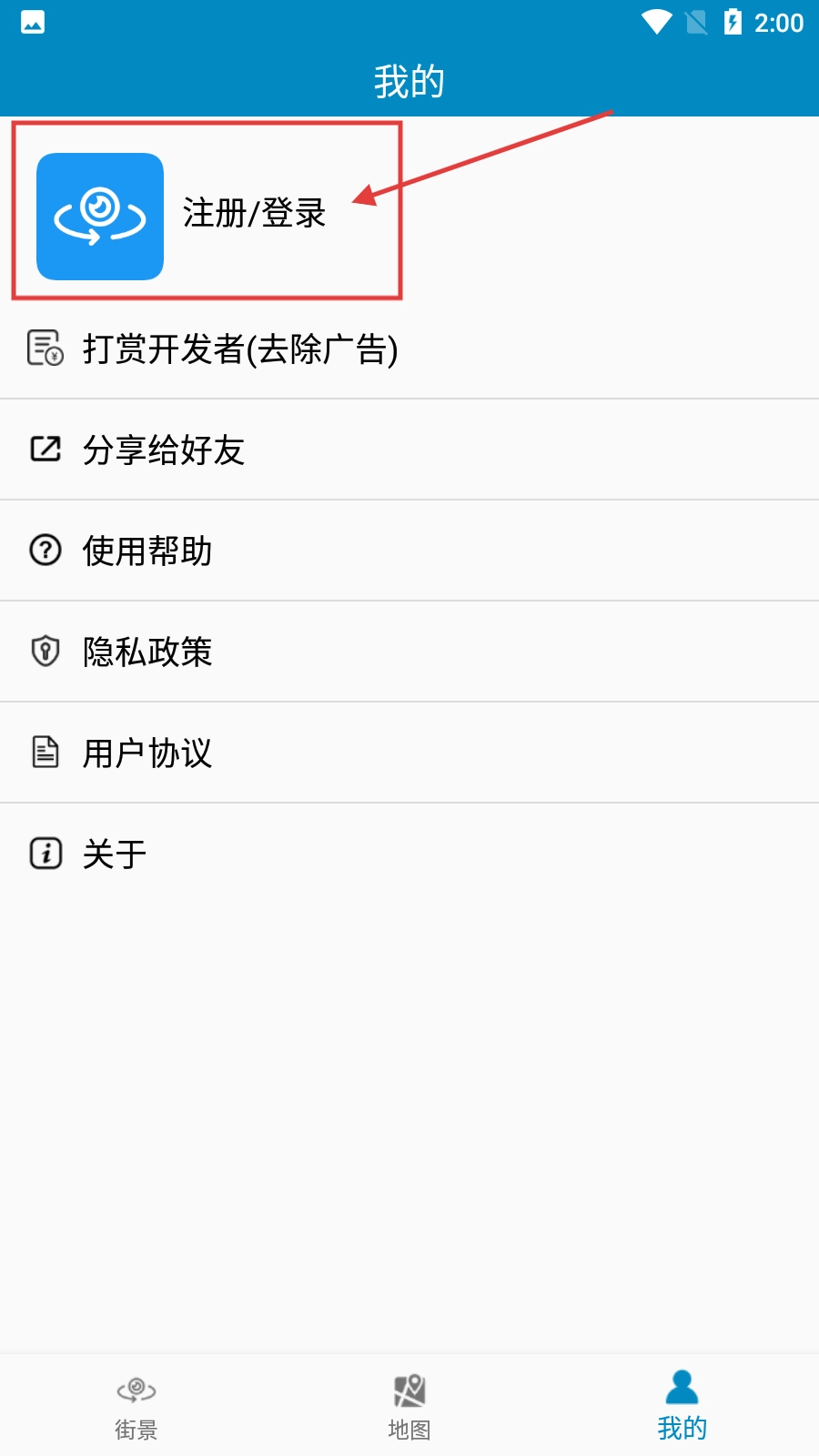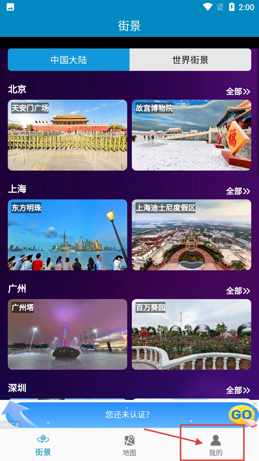 在街景类首页,点击右下角的【我的】按钮,即可进入个人中心页面。