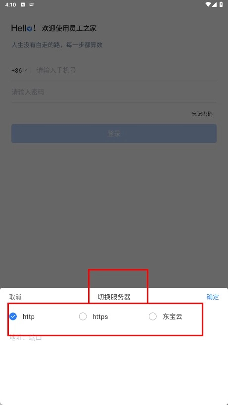在服务器选择界面,能够切换【http】【https】【东宝云-服务器选项】这几个选项,选定之后点击确定按钮即可。