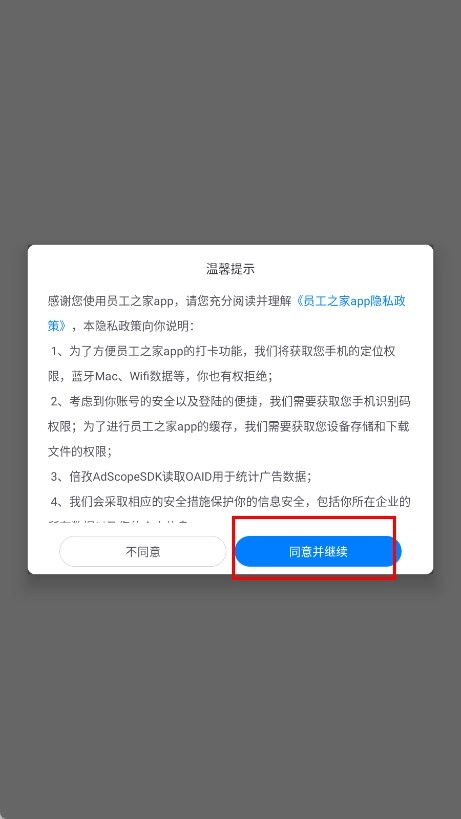 在温馨提示弹窗中,点击【同意并继续】功能按钮,即可进入员工之家体验页面。