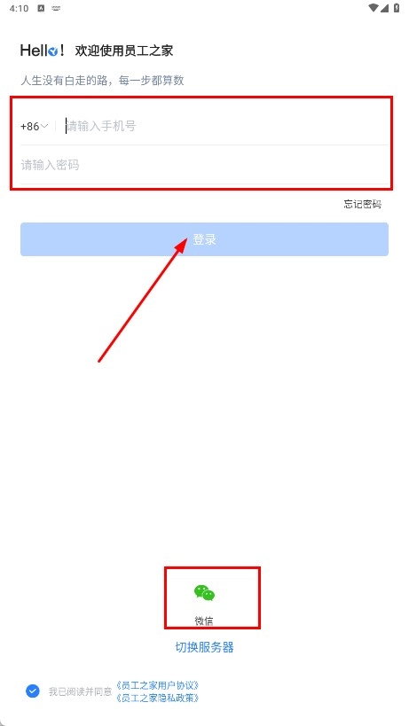 在登录页面填写手机号与密码后,点击【登录】功能按钮即可登录;此外,也能通过点击【微信】功能按钮完成微信登录操作。