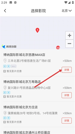 在城市选择页面,点击“北京”这一选项后,即可进入影院选择页面。