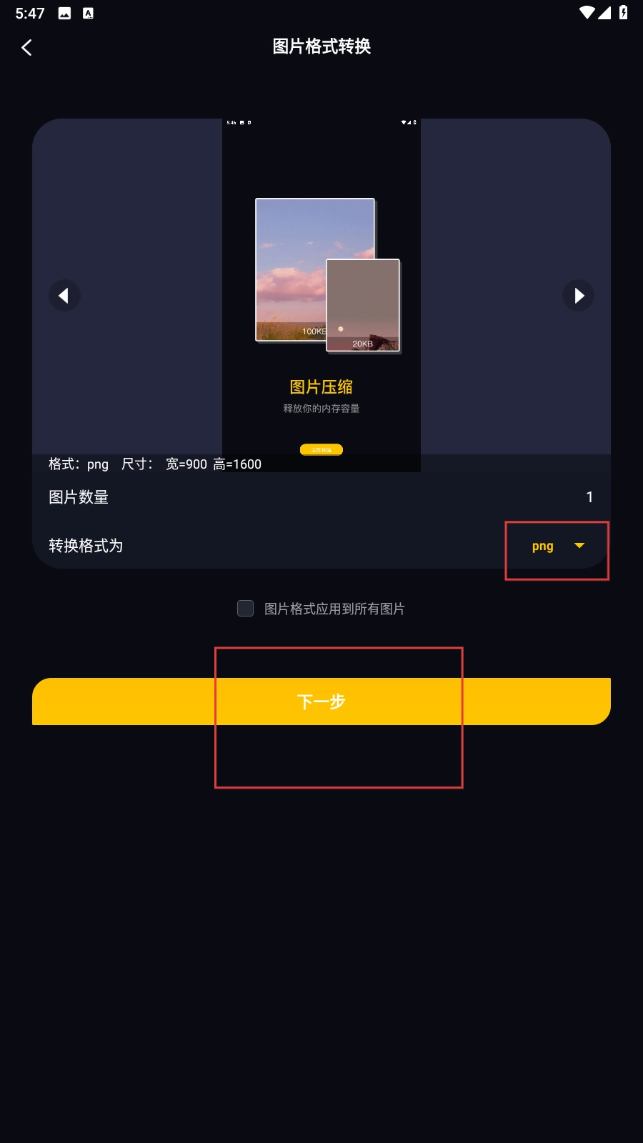 在选择好图片之后,先设置好转换的格式(例如png格式),接着点击【下一步-功能按钮】。