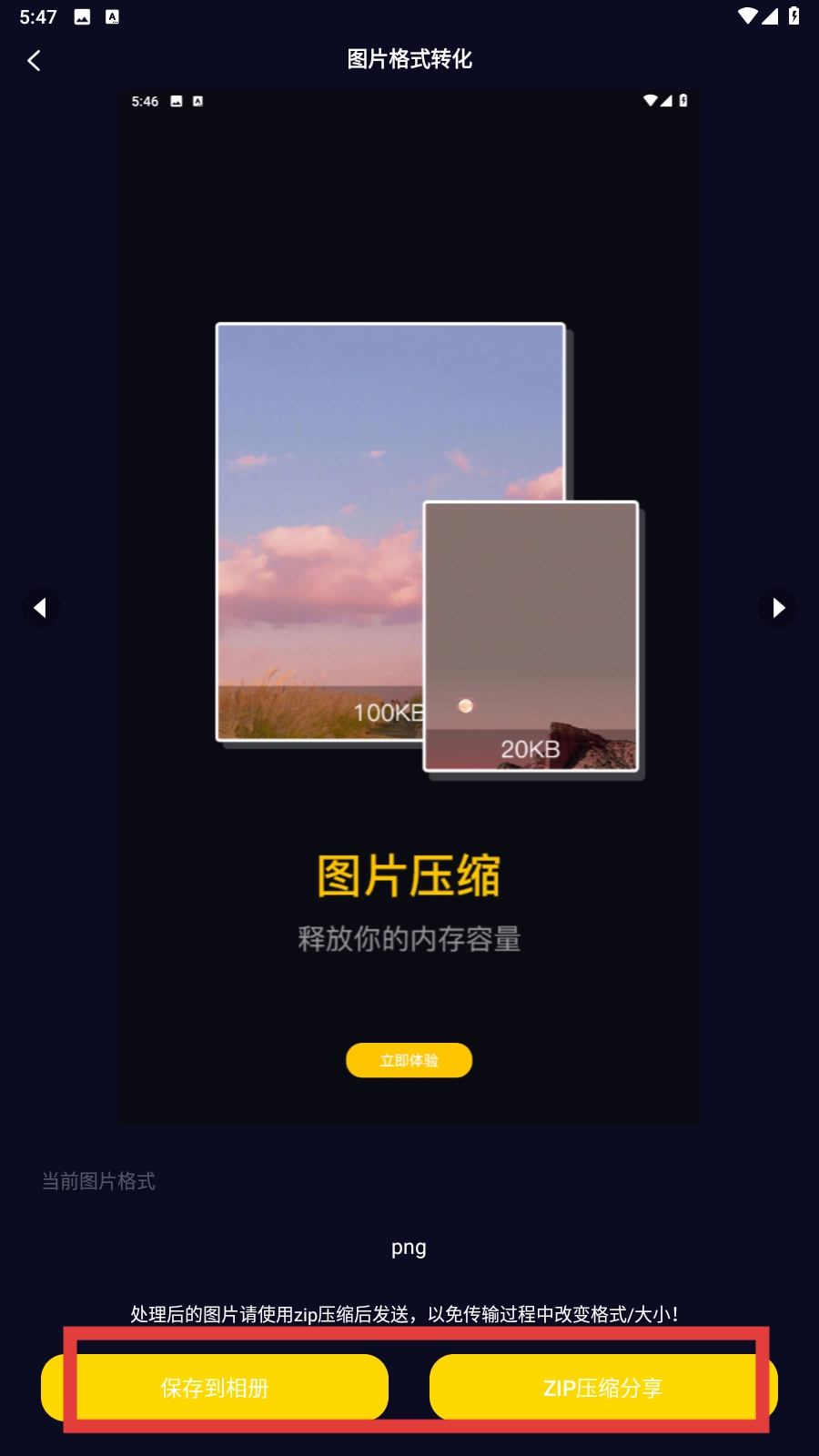 转换完成后,可选择【保存到相册】或【ZIP压缩分享】功能按钮,完成图片格式转换后的后续操作。