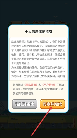 在“开心答题宝”弹出的“个人信息保护指引”窗口里,点击【同意并继续】按钮,以此允许应用调用相关权限,进而继续使用该产品。