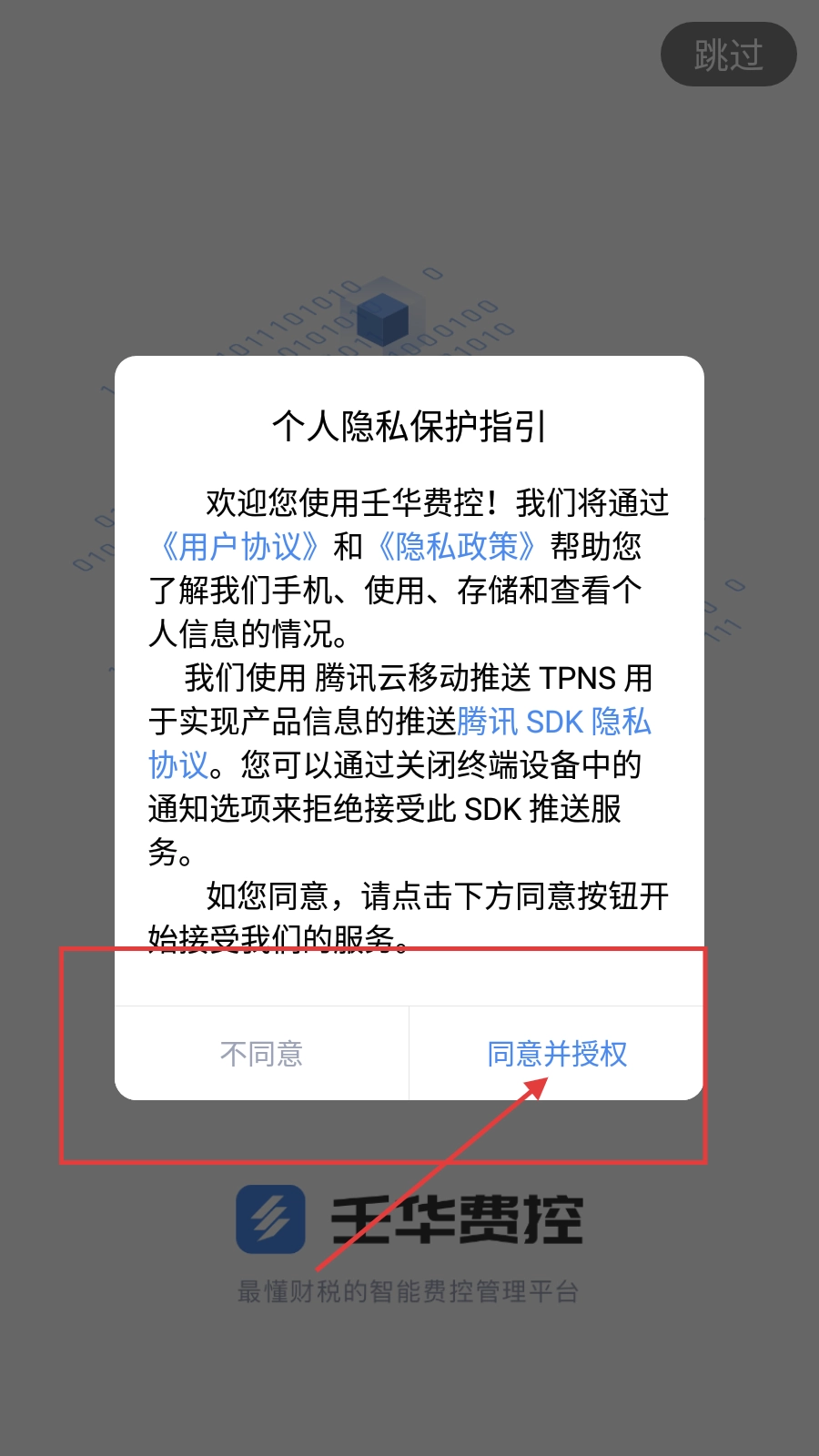 打开壬华费控后,页面会弹出【个人隐私保护指引】,在仔细阅读相关内容后,点击【同意并授权】按钮,就能进入软件功能介绍界面。