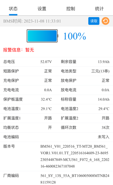 状态:主要呈现电池基本信息、Soc容量、单串电压、均衡信息、充放电保护状态、温度保护状态以及循环次数等相关信息。(若数据并非最新,可尝试点击刷新图标以获取最新的电池信息。)
