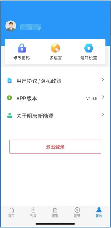 个人中心具备修改密码、语言选择、通知设置、用户协议以及退出登录等功能。