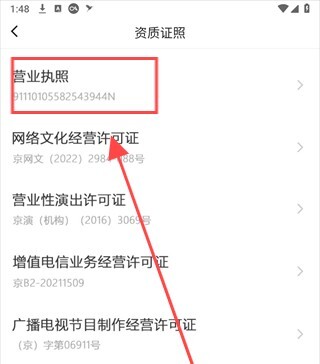 2、接下来,进入资质证照页面,点击页面中的营业执照功能。