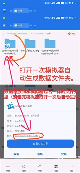 ①所需文件(包括apk安装程序、obb模拟器数据包、必要的so文件或用于过检验的apk补丁)(如下图所示,了解安装包和数据包概念的用户可忽略此说明)