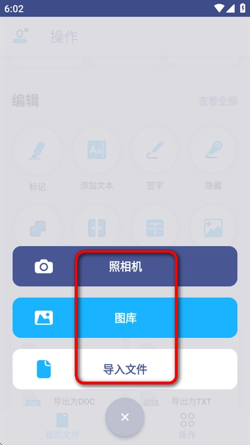 4、选择\\"拍照\\"直接扫描文档,选\\"相册\\"处理手机图片,\\"导入\\"可添加其他文件