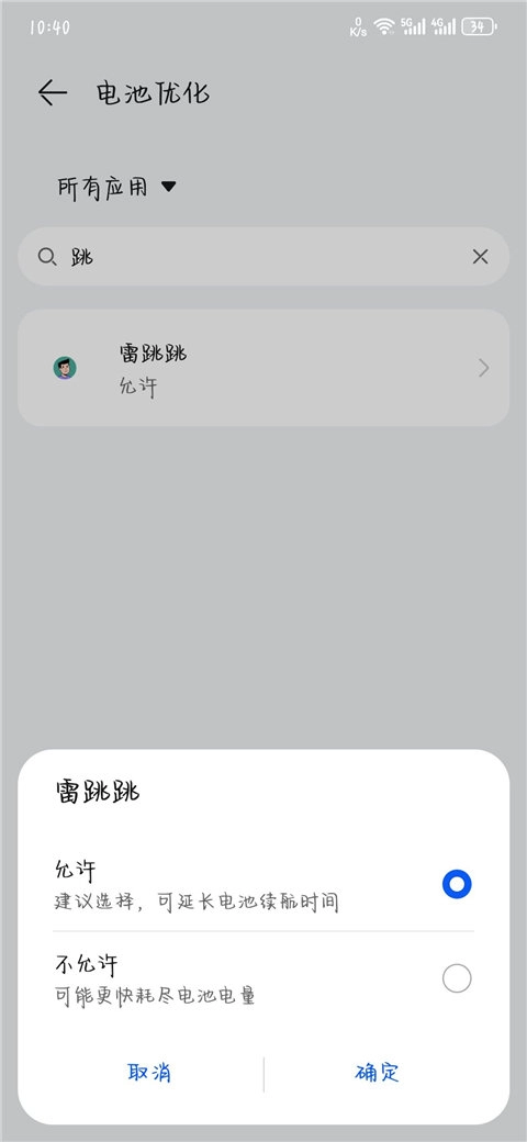 你可以按照以下路径操作:进入设置界面,找到电池选项,点击进入后选择应用耗电管理,在应用列表中找到雷跳跳,然后开启允许完全后台行为和允许应用自启动这两个功能。