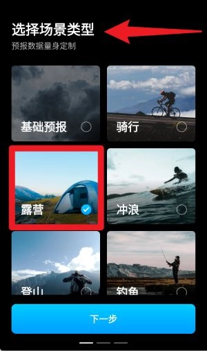 用户首次打开首页使用时,系统会引导其选择露营、骑行、冲浪等不同场景类型,待用户依据自身需求勾选完毕,点击“下一步”即可进入专属天气服务。