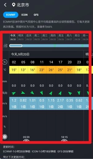 在天气详情页面,您可以查看未来10天的逐小时气温、风力、风向以及降雨预报,并且支持切换查看ECMWF等多种专业气象模型的数据。