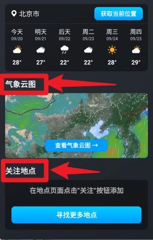 下滑页面即可进入气象云图区域,查看卫星云图的实时变化;还能借助“关注地点”功能收藏常用城市,以便日后快速查看。