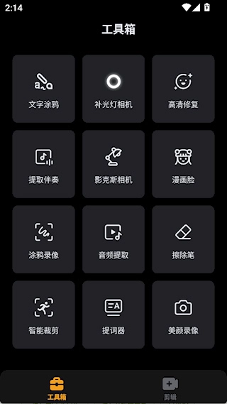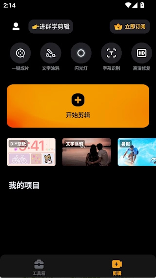 【剪辑】界面具备一键成片、文字涂鸦等功能,点击“开始剪辑”导入视频即可进行剪辑操作。