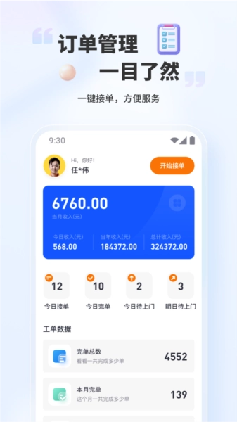 一键接单模式:点击“开始接单”按钮,即可开启接单赚钱模式,便捷接收各类工单。