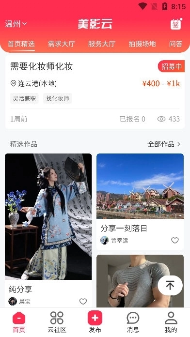 3、提供可在线发布需求信息的平台,用户可在此寻找摄影师、化妆师、修图后期等灵活兼职人员,或对接影像外包等服务,也能查看服务提供者的过往案例。