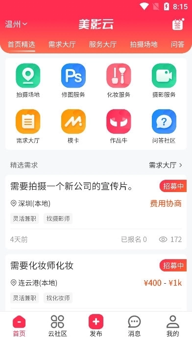 【需求大厅】支持在线发布寻找摄影师、化妆师、修图后期等灵活兼职岗位,以及影像外包等合作需求的信息;需求发布完成后,用户能够实时查看相关的响应进度。
