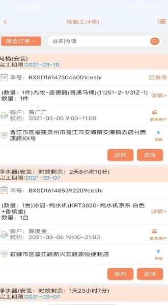 2、应用内设有待预约与待施工两大版块,方便用户查看各类待处理订单的详细信息,从而快速推进并完成订单处理。
