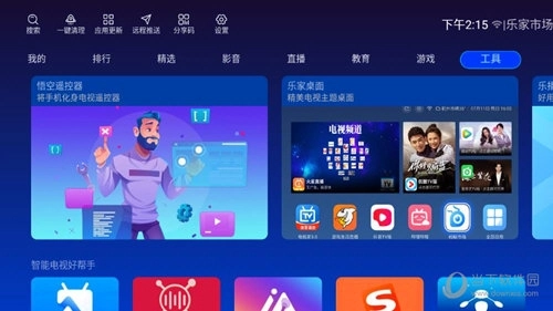 1、打开乐家市场电视版后,首页会呈现出精选、排行、影音、直播、教育、游戏、工具等众多功能模块。